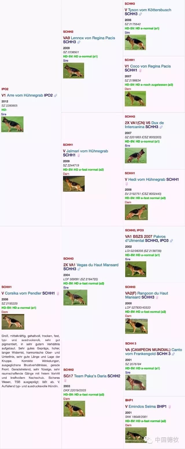 与此同时,不得不提的还有小阿瑞的妈妈:柯西卡(Corsika vom Pendler)柯西卡不论是自身的遗传价值还是后代繁殖延续价值都是近十年来德国的典范。小阿瑞的妈妈威嘎斯女儿柯西卡交配泰森出:VA达诺;柯西卡交配雷诺克斯出:德国VA优克(Yoker).柯西卡交配阿瑞(Arre)出了小阿瑞。
