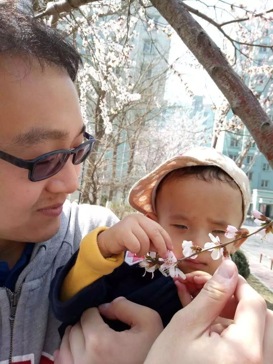 (上图是前几天面包哥带小面包在小区里的桃树下摸桃花,同时还给小主提供了私人定制的口述服务。照片中被爸爸抱着的小面包双只手正在捏花瓣,一副认真脸给人感觉好像他“看”到了一样,不愧是我家的影帝!)