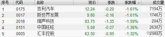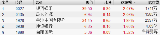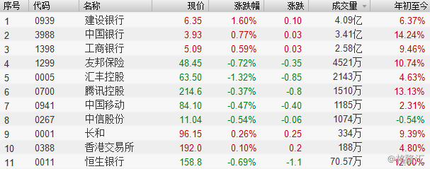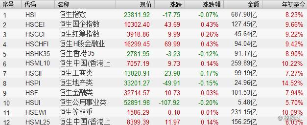 截至收盘,恒指收报23827点,跌0.01%,其中汇控贡献了-32点;国企指数收报10315点,涨0.55%,其中建设银行贡献了16点;红筹指数收报3924点,涨0.39%;大市全天共成交687.98亿港元,明显低于昨日成交量。