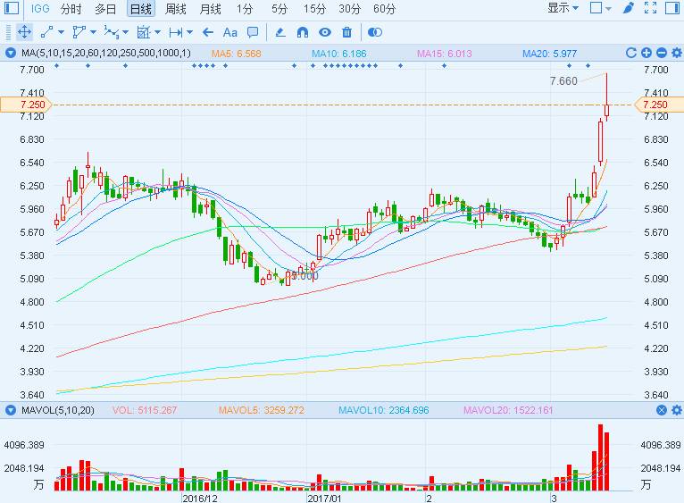 即将于3月22日发布业绩的IGG(00799.HK)[深港通]近期涨势异常凌厉,3月份至今的涨幅达38%,今日该股盘中一度涨逾7%,高见7.66港元,但升势未能持续,截至收盘最终报7.25港元,涨2.98%,成交3.77亿港元。