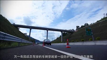 新增一道可感应的爆破充气锥筒置于后方