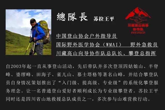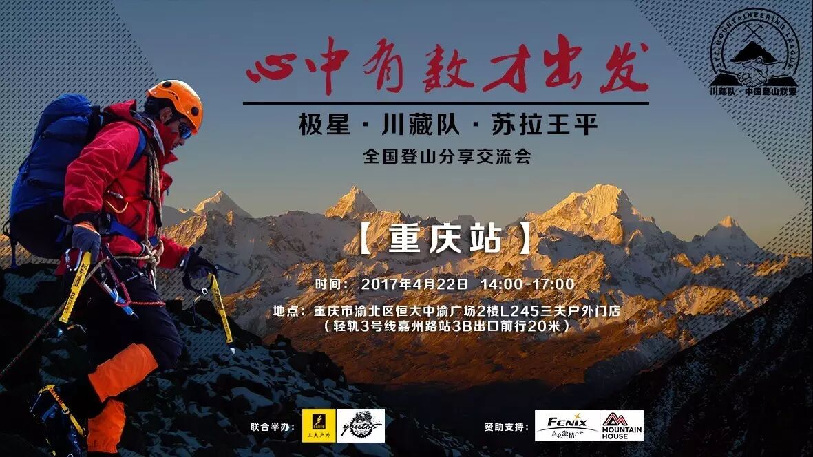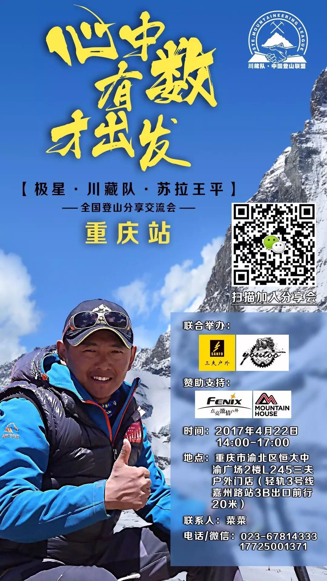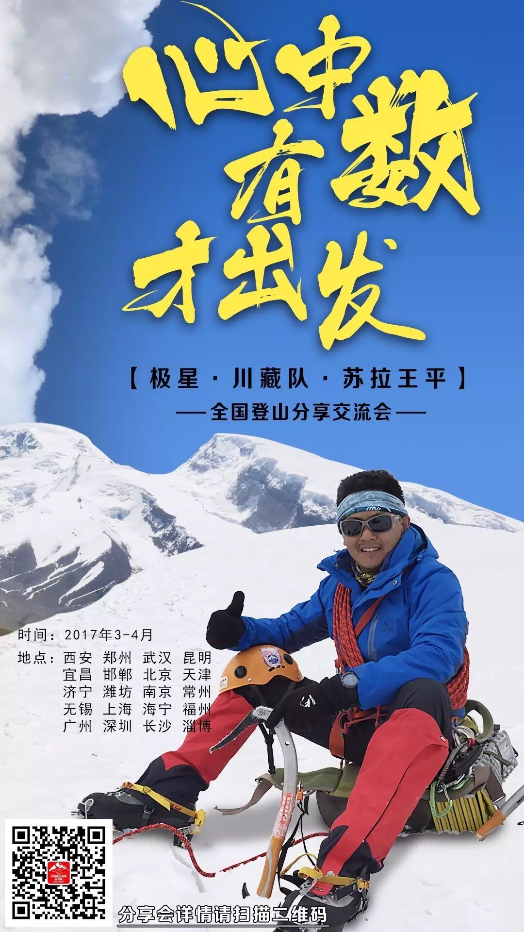 为了回馈山友们的热情,普及登山常识,倡导“心中有数才出发”的安全攀登理念,吸引和指导户外爱好者接触这项极具魅力的运动,川藏队正式启动了2017年全国登山分享交流会。分享会第一期在全国20个城市开设22场次,将由川藏队创始人兼攀登总指挥苏拉王平先生主讲,面对面地与山友们交流,为大家展示一个真实的攀登世界,详细地讲解不同海拔山峰的特色和攀登体验,帮助更多人了解和准备自己的雪山成长,谱写更多人与山峰的美丽故事!