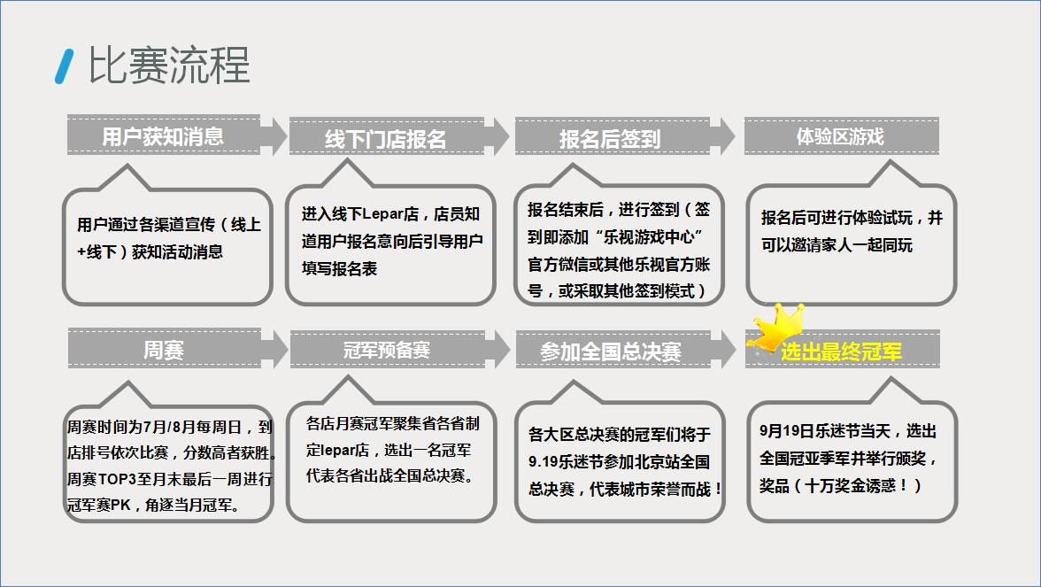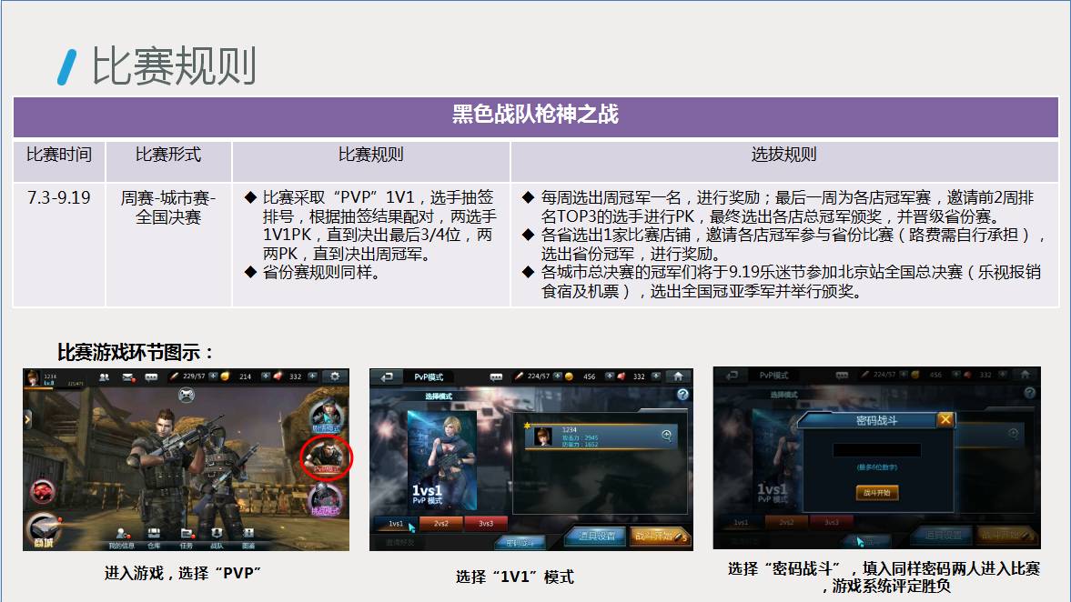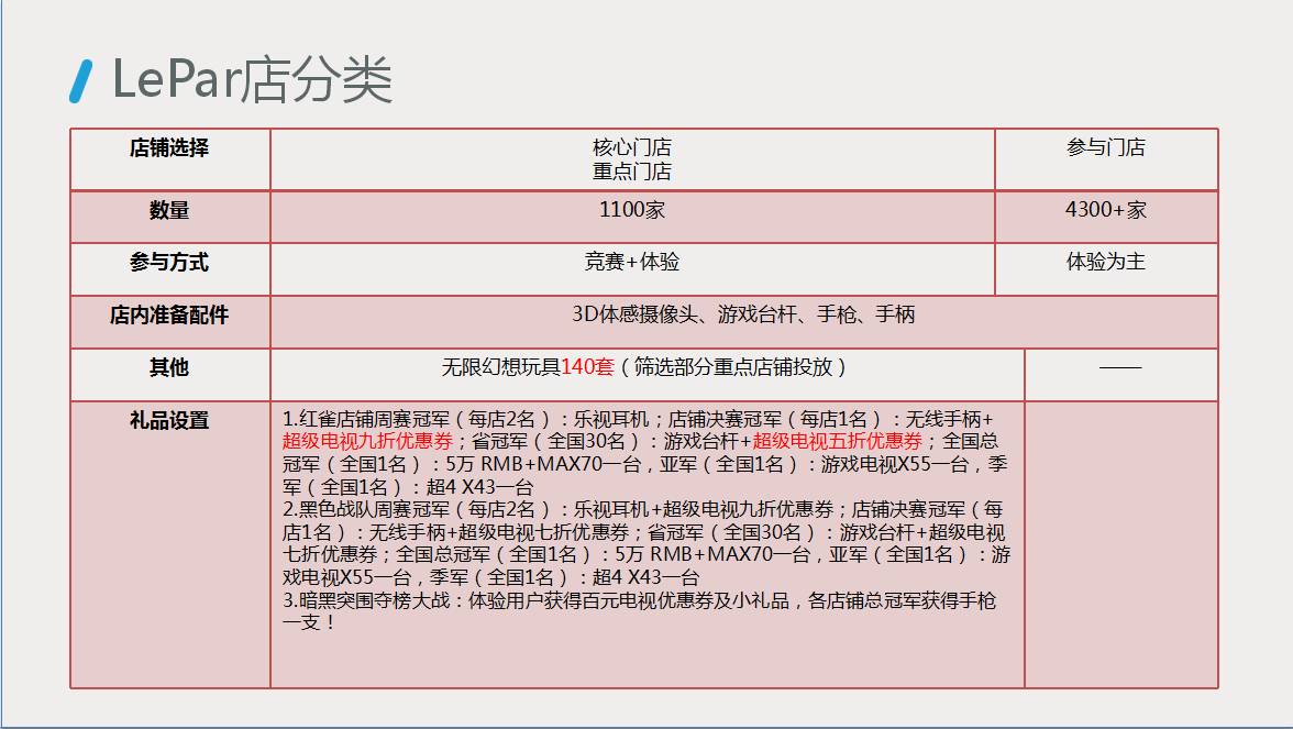 (3)7月25日-8月14日,共三周,比赛游戏为黑色战队,采取周赛-冠军赛(店铺冠军)赛制;每周选出周冠军一名,进行奖励;最后一周为冠军赛,邀请前2周排名TOP3的选手进行PK,最终选出各店总冠军颁奖。以省为单位,选出一家Lepar店作为半决赛据点(全国共30家)。8月28日两周周末决出黑色战队各省第一名,各省总冠军9月19日进京举行全国总决赛!冠军将赢取现金五万元+Max70一台!