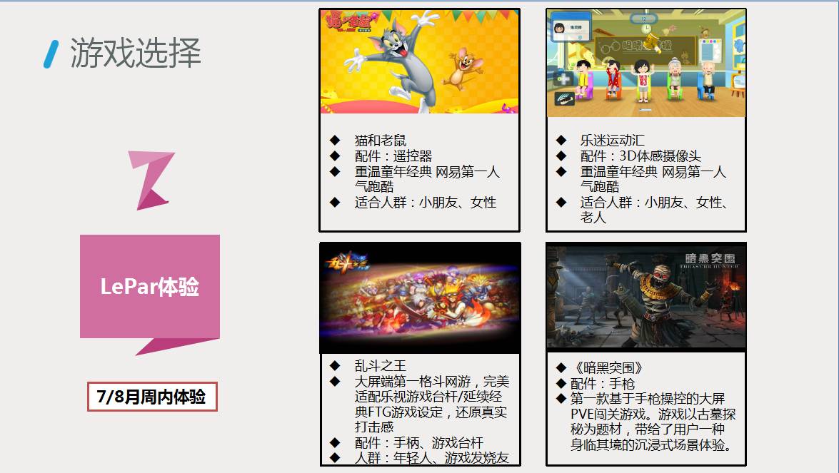 (5)除此之外,整个暑期还开展了精彩的体验活动,范围覆盖4500家lepar店,游戏内容包括亲子游戏、休闲体感、横版格斗、人气跑酷游戏等,丰富您一整个暑期!进店体验还送超级电视优惠券哦,赶紧呼朋引伴来参加吧!