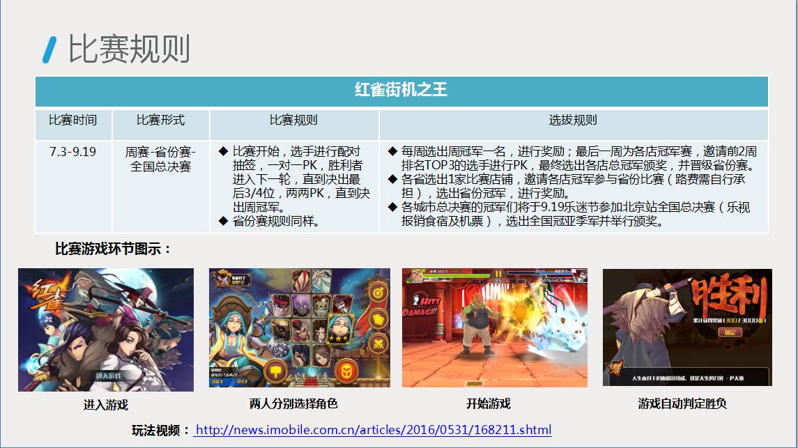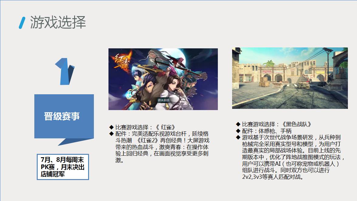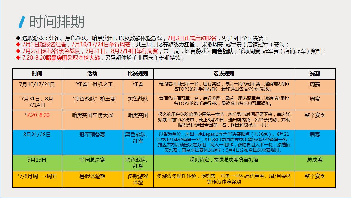 (1)比赛共选取三款游戏:红雀、黑色战队、暗黑突围, 整体活动从7月3日正式启动报名,全国1100家店同时开启比赛,经过层层晋级,60名优胜选手将在9月19日,在北京举行全国决赛;