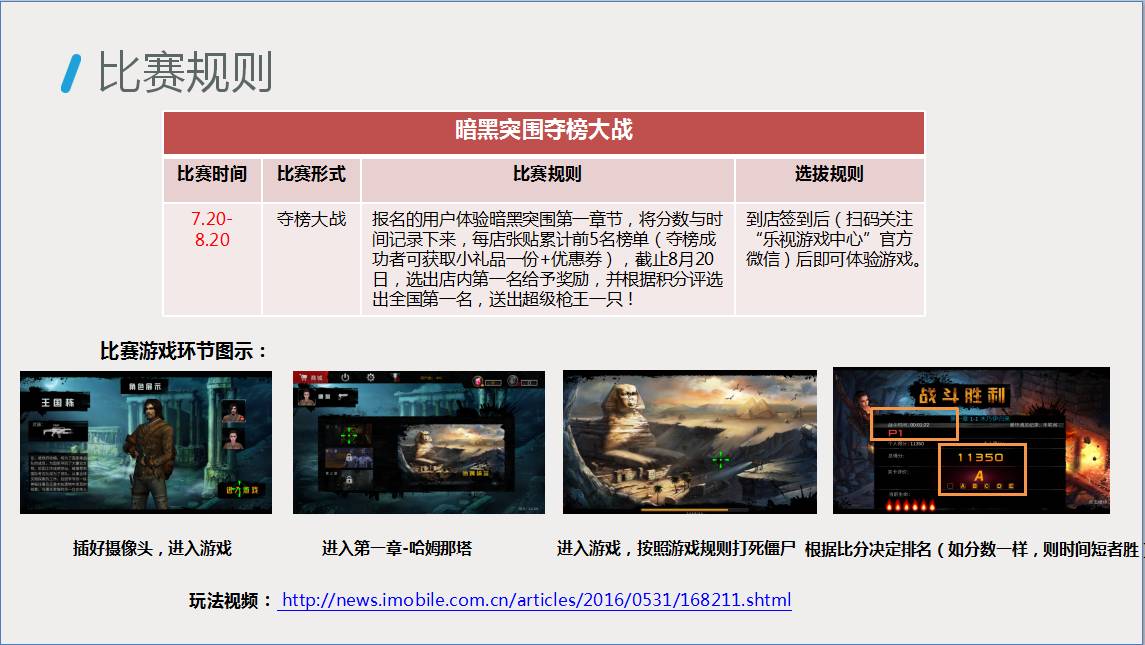 (4)7.20-8.20暗黑突围采取夺榜大战,另暑期体验(非周末)长期持续。报名的用户挑战暗黑突围第一章节,将分数与时间记录下来,每店张贴累计前10名榜单,截止8月20日,选出店内第一名给予奖励,并根据积分评选出全国第一名,送出超级枪王一只!