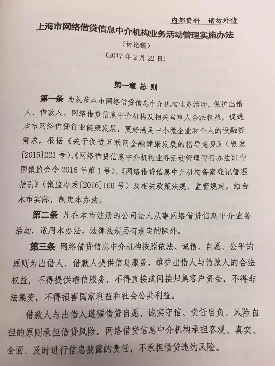 凤凰财经:2月22日,上海市金融办召集部分P2P平台举办讨论会,主要针对《上海市网络借贷信息中介机构业务活动管理实施办法(讨论稿)》。