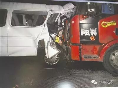 车祸现场,重型货车从后方车道追尾中型客车,客车尾部被撞得严重变形