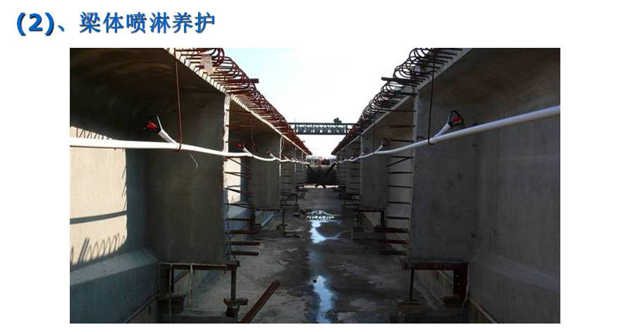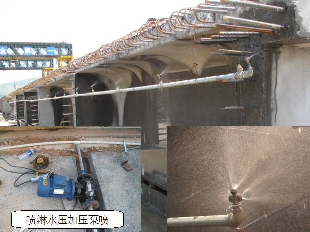 场地内必须根据梁片养生时间及台座数量设置足够的梁体养生用的自动喷淋设施,喷淋水压加压泵应能保证提供足够的水压,保确保梁片的每个部位均能养护到位,尤其是翼缘板底面及横隔板部位。养护用水需进行过滤,避免出现喷嘴堵塞现象。