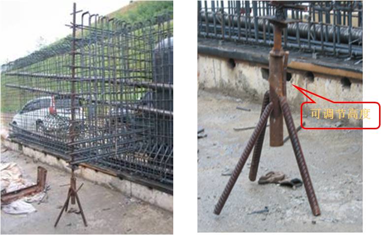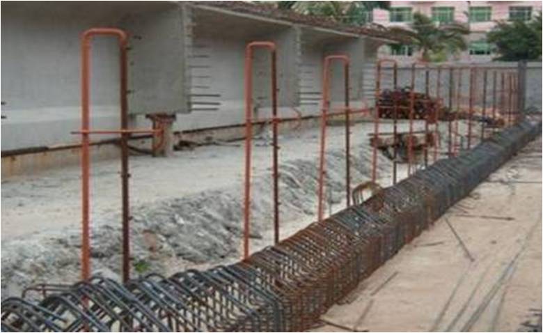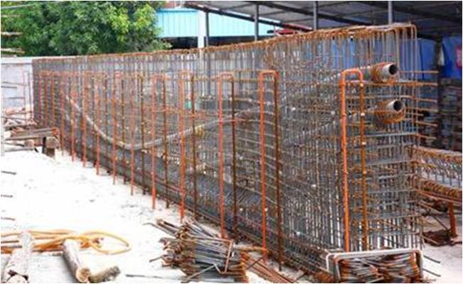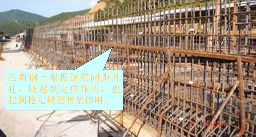 肋板钢筋绑扎采用竖向平台定位绑扎法绑扎,在水平混凝土地面上,制作肋板竖向间距槽,间距槽采用角钢切槽,长度按照设计图肋板长确定。竖向筋按照间距槽摆放,并穿入横向筋固定,横向筋间距由横向间距架固定。