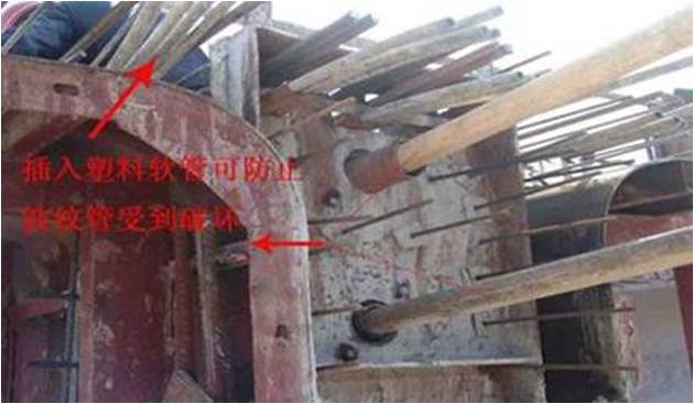 圆形波纹管在浇筑前应穿入比波纹管内径小1cm的塑料软管,负弯矩波纹管穿入四根小塑料软管,防止波纹管挤压变形、漏浆,确保在进行预应力施工时的质量。塑料衬管应在砼初凝后及时抽出 。