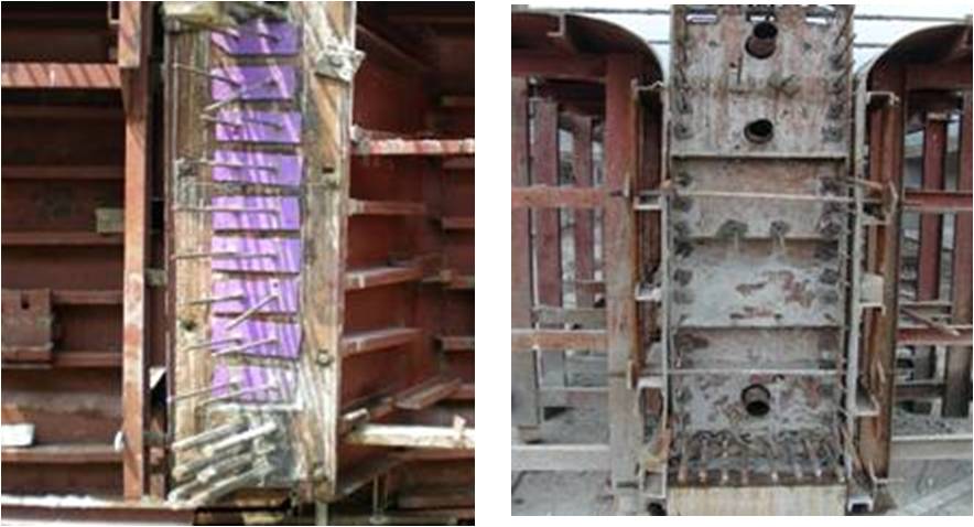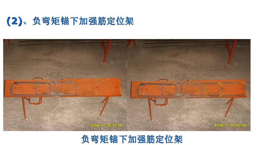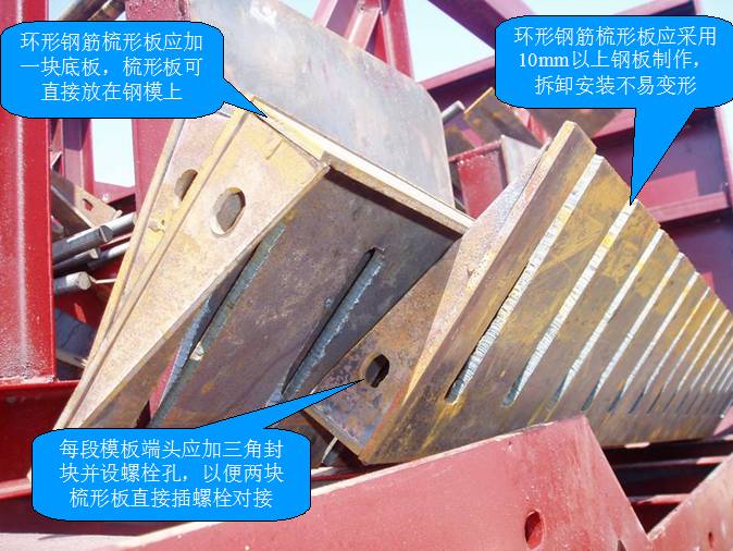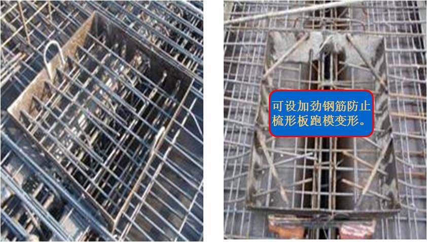 负弯矩张拉槽必须使用梳形模板,可内焊四根加劲钢筋进行支撑防止变形,待梁体混凝土初凝后即可拆除 。