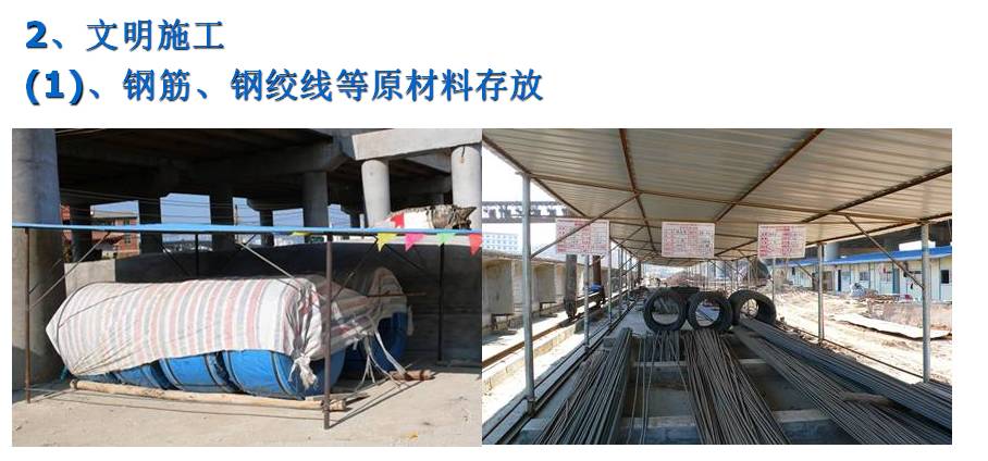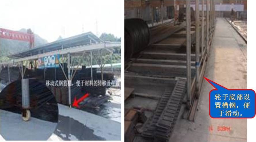 推广使用移动式钢筋棚用于钢筋、钢绞线等材料存放,满足材料存放、防雨防潮、通风的要求,禁止钢材露天堆放或仅用彩条布等简单覆盖 。