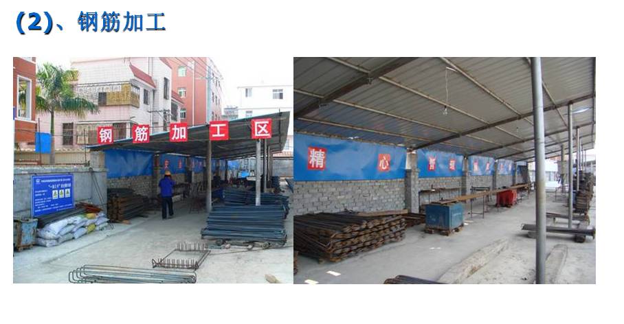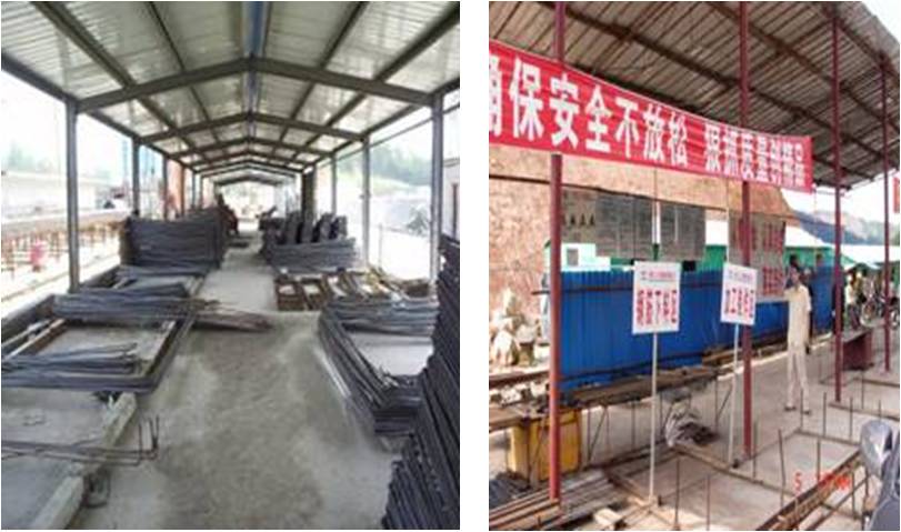 棚内地面应用5cm厚C15砼进行硬化,有车辆行驶区砼硬化厚度为12~15cm,棚内按照其使用功能分为:原材料堆放区、钢筋下料区、加工制作区、半成品堆放区,钢筋要离地20cm以上 。
