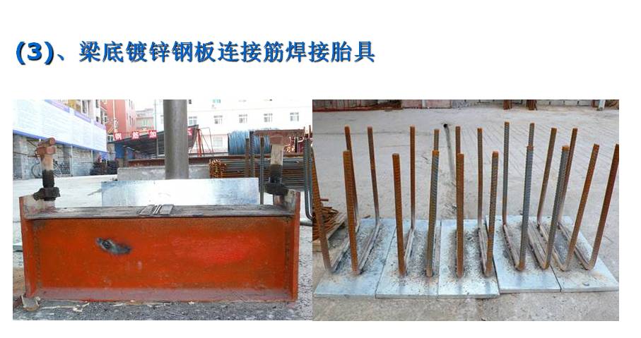 支座预埋钢板必须进行热浸镀锌防锈处理。由于采用U型锚筋与镀锌钢板直接平焊极易引起支座预埋钢板平面变形,支座预埋钢板的锚脚连接筋焊接应采用夹具焊接,将镀锌钢板加固于夹具上,在夹具与镀锌钢板中间接触位置垫支3~5mm薄钢片,在加固镀锌钢板时预留出反拱,待焊接完成拆除夹具时,镀锌钢板可恢复成平直形式;或是采用钻孔焊接,防止焊接钢板时弯曲变形。