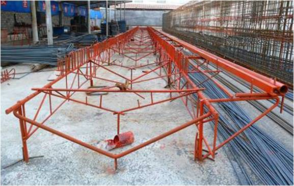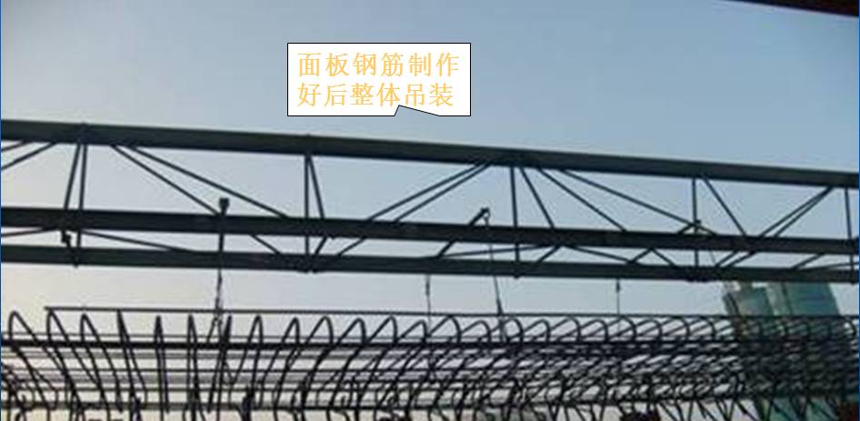 面板钢筋也可整体绑扎好后再进行吊装。加工平台根据设计图纸固定间距槽,间距槽采用8# 圆钢以疏筋形式焊制,再将半成品钢筋摆放于平台钢筋间距槽内进行绑扎。钢筋面板制作平台外侧按照翼缘环形钢筋位置固定一根纵向钢管,以保证环形钢筋整齐。