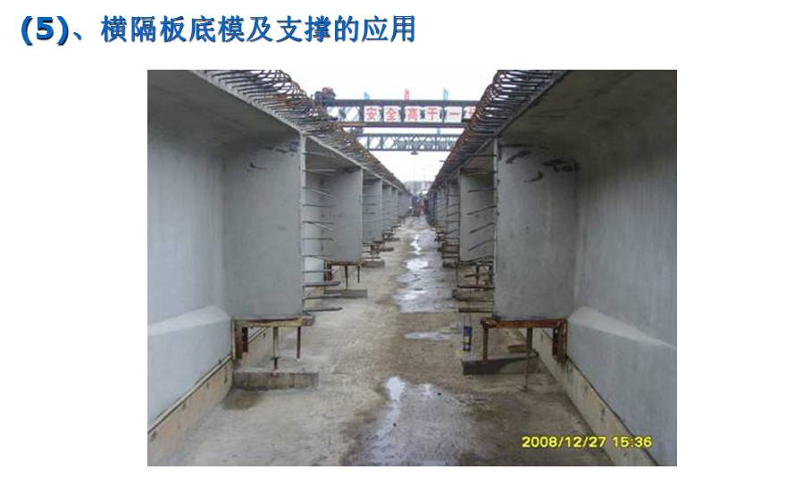 T梁横隔板底模不应与侧模联成一体,必须采用独立的钢板底模,以保证在先拆除侧模后,横隔板的底模仍能起支撑作用,直至张拉施工后才能拆除,避免横隔板与翼缘、腹板交界处出现因横隔板过早悬空而产生裂纹,同时模板数量应满足施工需要。