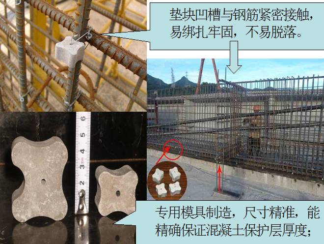 钢筋的保护层垫块推广使用梅花形高强度砂浆垫块,确保垫块能承受足够压力而不破碎,绑扎牢固可靠,纵横向间距均不得大于0.8m,梁底位置不得大于0.5m,确保每平方米垫块数量不少于4块 。