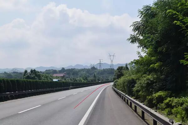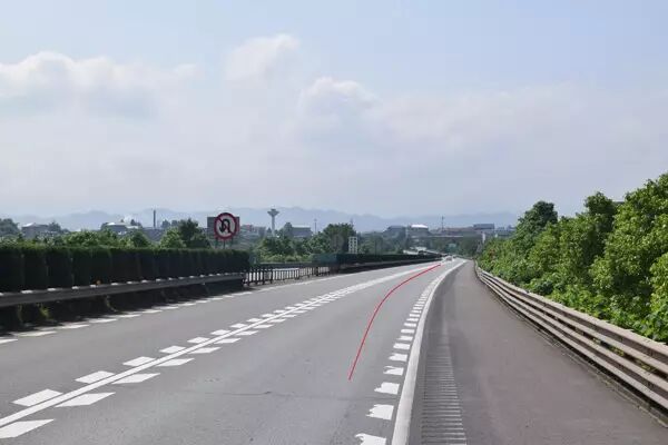 路段描述:该路段为本文所提到的往西方向的起始路段,属于连续800m的下坡弯道,车辆行驶至该路段时速度容易过快,尤其是重、中型货车,提速相对容易,超速行驶较为多发;同时因是弯道路段,视距缩短,驾驶人不易发现弯道外的道路情况并及时做出应急反应,这里曾多发追尾二次事故。