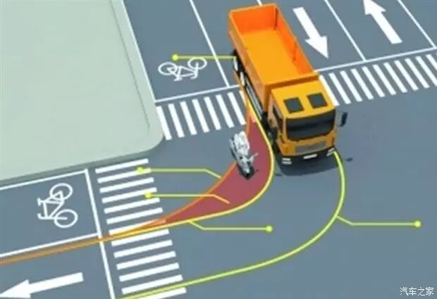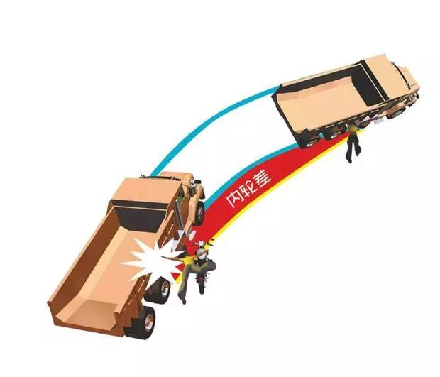 大货车在转弯时,会有一个专用的名词叫内轮差,也就是转弯一侧的前后轮之间的差量,就是图中红色区域。