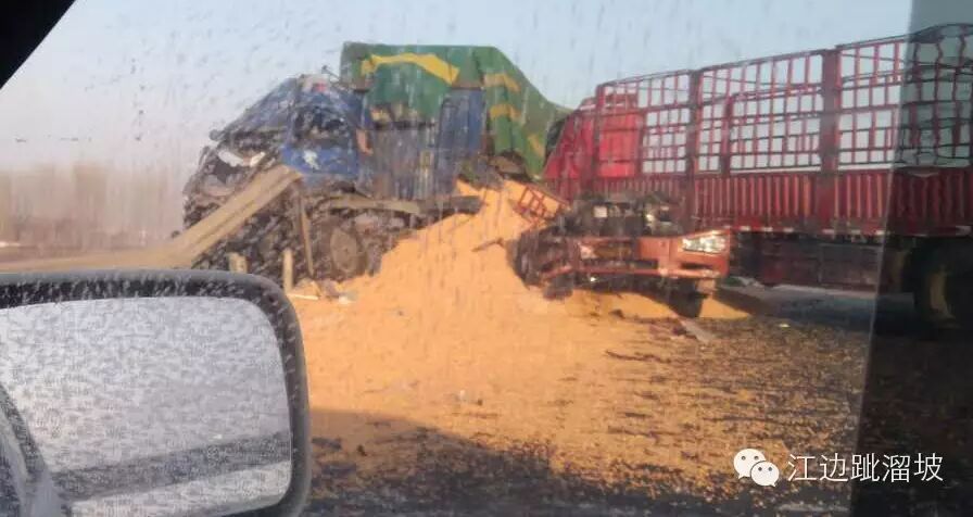 从图片看,红车只剩车头底部及车后货架。而蓝车车头也受损严重,驾驶室变形。且有半个已撞破护栏,冲出公路。车上运载的苞米散落一地。