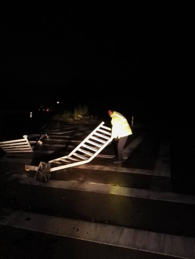 20时许,钟山的天气依然还是风雨交加。民警们驾车巡逻至钟山高速引路十八公岭路段时发现公路中间的护栏已损坏倒在路面,对过往车辆的安全通行造成及大的安全隐患。值勤民警吴润知二话不说,下车徒手清除损坏的公路护栏。