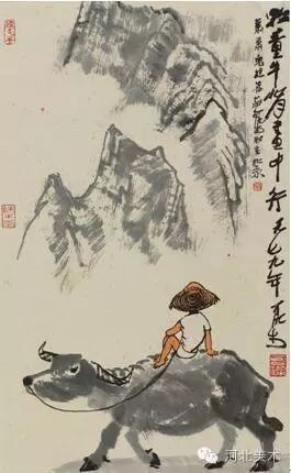 《牧童牛背画中行》正是可染先生牧牛图中的代表作之一。画面中描绘的是水牛在乖顺地吃草,一牧童坐在牛背上,一手握着缰绳,一手提着小斗笠,深深遥望着巍巍青山的情景。李可染先生曾经说过“意境就是景与情的结合;写景即是写情。”而此幅《牧童牛背画中行》正是情景交融的最好诠释。