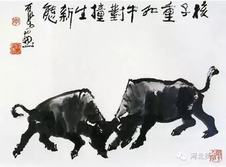 我国山水画大师李可染先生,笔墨苍健,意境清新,自成一家。他又酷爱画牛,笔下敦厚勤劳的耕牛与天真活泼的牧童,相映成趣,诗情画意,跃然纸上。他不只画牛,寄托情思,还以牛为师。他的画室名为“师牛堂”,又有“师牛”、“师牛堂”、“孺子牛”诸印,以示其志。