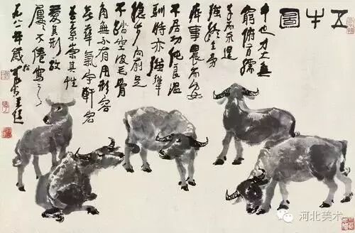 到了上世纪80年代中期,李可染先生的画作,尤其是以牛为题材的绘画作品达到了一个新的境界,升华为一种对牛的精神的理解,这精神也是画家本人做人、作艺的准绳。如他在《五牛图》和《九牛图》中,将或行、或卧等各种不同情态的牛表现得淋漓尽致。在这两幅画上,李可染均题上同一段题跋,“牛也,力大无穷,俯首孺子而不逞强。终生劳瘁,事人而安不居功。纯良温驯,时亦强犟,稳步向前,足不踏空,形容无华,气宇轩昂,吾崇其性,爱其形,故屡屡不厌写之。”爱牛之心跃然纸上。