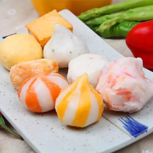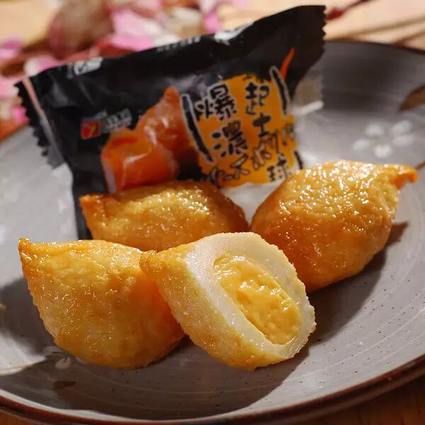 顶级鱼浆制作而成的亮力金黃色泽外皮,包裹着加入红色浓厚润滑的蝦蛋,味道甘醇鲜美。那內馅的香甜,让人一口吃下,忍不住细细品尝的好味道。火锅必备食材。