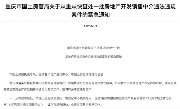 昨(11)日,重庆市国土房管局官网发布了《关于从重从快查处一批房地产开发销售中介违法违规案件的紧急通知》,决定开展整顿规范房地产开发销售中介行为专项工作,通知称,对存在违法违规行为房地产开发和中介企业及相关从业人员,要依法采取责令限期整改,处以罚款、取消网上签约资格、停业整顿等措施,并纳入“黑名单”。