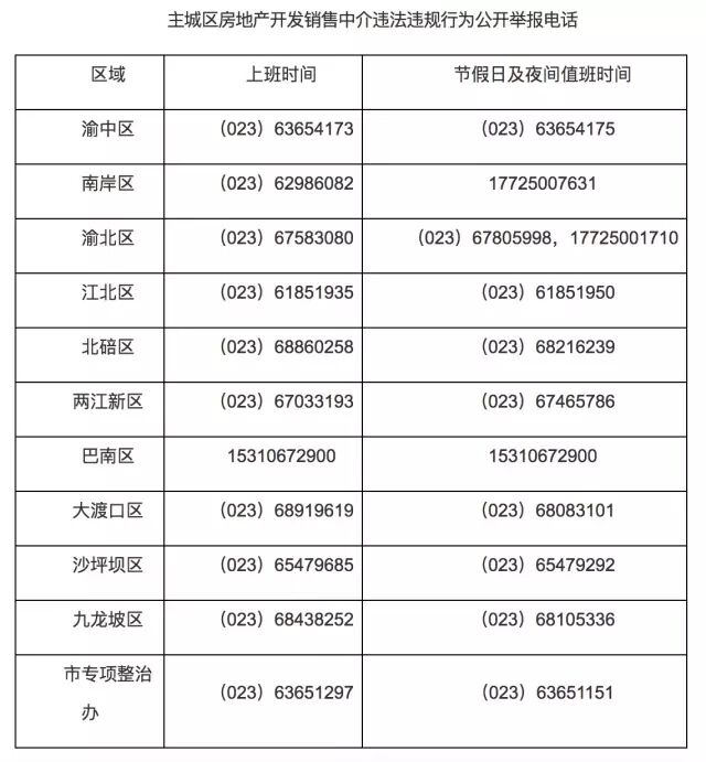 主城区房地产开发销售中介违法违规行为公开举报电话。来源:重庆市国土房管局网站