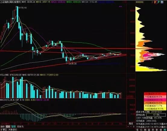 以上是大盘周线级别筹码分布图,首先观察三角整理平台,很明显,在前三周底分型形成之后,本周得到了正式确认。