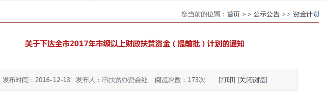 全市2017年市级以上财政扶贫资金(提前批)计划!