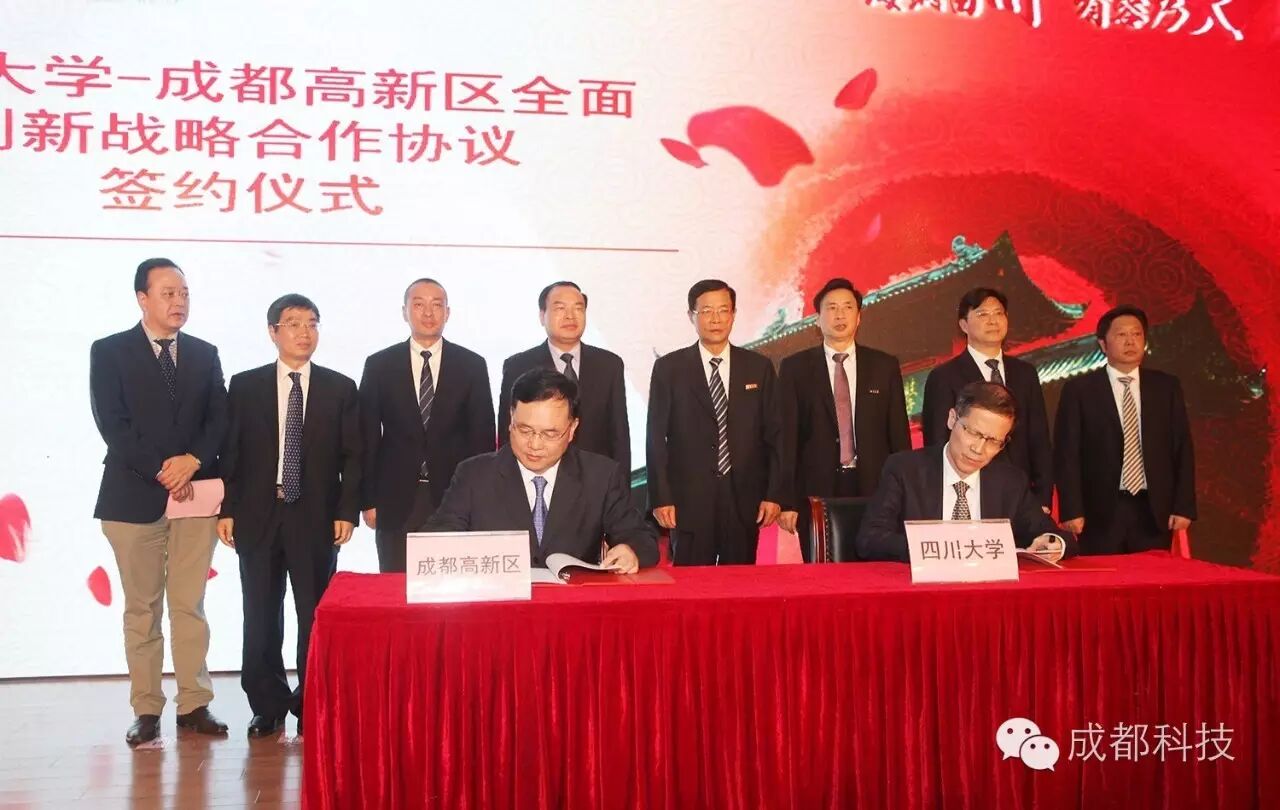 ▲四川大学常务副校长李光宪与成都高新区管委会主任苏鹏分别代表四川大学和成都高新区签订《四川大学-成都高新区全面创新战略合作协议》