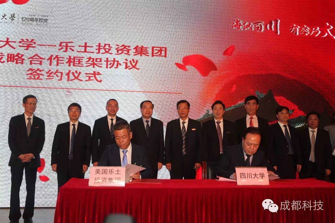 ▲四川大学常务副校长李虹与美国乐土投资集团董事长刘如银分别代表四川大学和美国乐土签订《川大--乐土集团战略合作框架协议》