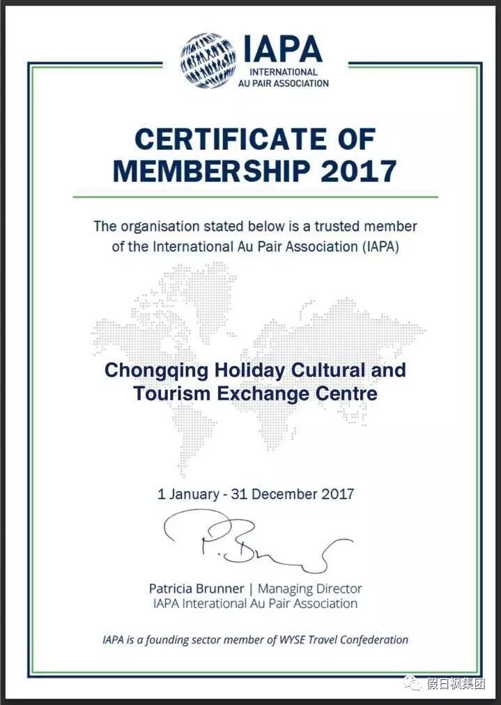 重庆假日文化与旅游交流中心经过IAPA(国际AuPair协会)为期三个月的严格审核,作为正式会员(FULL VOTING MEMBER)于2017年1月30日正式加入IAPA。这是对我中心AuPair项目成功运作最权威的认可。