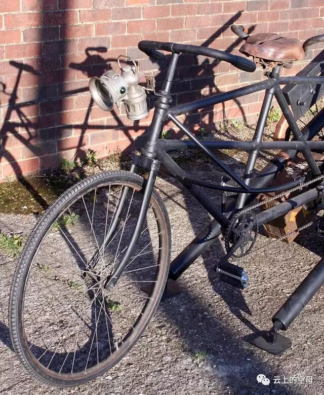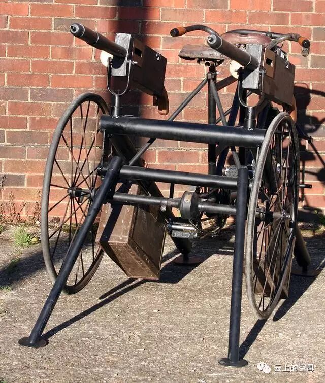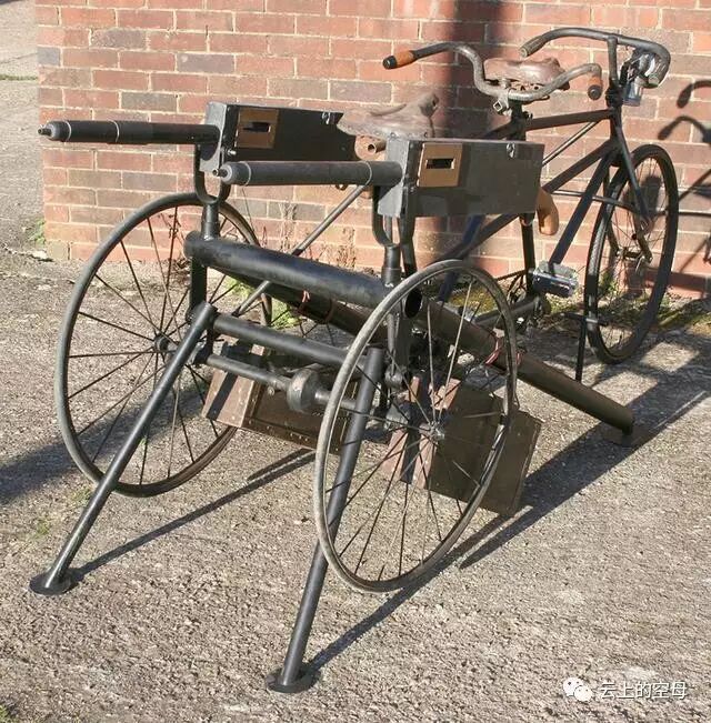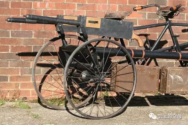图为维克斯三轮机枪车的前部特写。将自行车同重机枪结合起来,其实并不仅仅这一种,当时还有好几个类似的车型。尤其是在一战时期,欧洲各国军队曾大规模装备自行车,有好多成建制的部队。