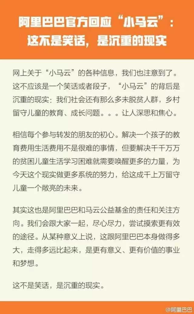 在网友爆料之后,一个对于诸网友来说万万没想到的剧情发生了!今年双十一前夕,马云通过内部邮件表示,“自己愿意承担‘小马云’的上学费用,供他大学毕业”。