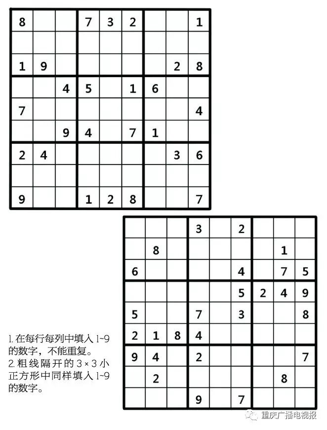 2.粗线隔开的3×3小正方形中同样填入1~9的数字。