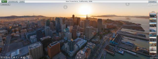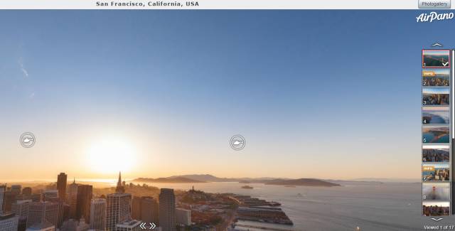 AirPano is a not-for-profit project focused on high-resolution virtual tours from a bird's eye view. AirPano has already photographed over 300 most interesting locations on our planet and it is the largest resource for 360° aerial panoramas in the world. There are about 3000 spherical panoramas on our website at the moment.1. 打开浏览器 登录到 AirPano 官方网站点击红框所示的”ALL Panorams“ 便可找到 FULL LIST ,即是所有记录在案的地点,选择一个你想观看的地点,即可进入全景模式进行观赏2. 选择一个城市,点击后打开,这里我以San Francisco, California, USA为例。鼠标操作方法如下:在左下角有各种功能按键,如图所示1~9从左到右分别是这即是各个定点摄影的位置,点击“直升机图标”键切换到另一个视角,观赏别处的细节,或者通过右侧缩略图进行转换视角也是可行的。4.回到首页 点击“360 vedio”可以选择各地航拍的全程视频这样的话,想要了解一个城市,足不出户就可以办到啦!先定个小目标,挣它一个亿,自己就可以亲自去这些地方旅行了,这种梦想成真的感觉,想想还真是有点小激动呢!!今天的分享就到这里啦!小伙伴们有什么新奇的想法或推荐,也可以给我们留言哟!
