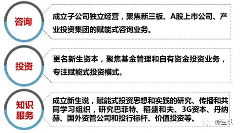 知识服务:成立新生说,研究巴菲特、稻盛和夫、3G资本、丹纳赫、国外资管公司和投行标杆、价值投资等。和君集团董事长王总说:新生说这个微信号的文章希望和君资本的同事都看看,这些文章有水平,也希望坚持做下去。什么样的团队会做这种不挣钱的事情呢?那一定是有信仰的人才愿意踏实做事情、写文章。任何事情只要坚持下去做,就一定会有成效。现在我们的方向就更清晰了,就是赋能式投资思想和实践的研究、传播和共同学习组织。今年我们启动的新生说研习社第一期,学员的质量非常高,包括3个上市公司董事长、几个新三板董事长,10个上市公司高管、10个创业企业CEO,几个投资人,如果研习社可以持续做下去会成为非常好的生态。