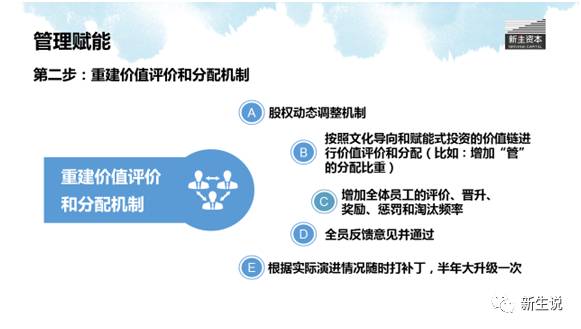管理赋能的第二步:重建价值评价和分配机制。在管理赋能里面,我们重建了价值分配体系,每一条本质上都是把使命愿景价值观贯彻到我们的价值评判体系里。