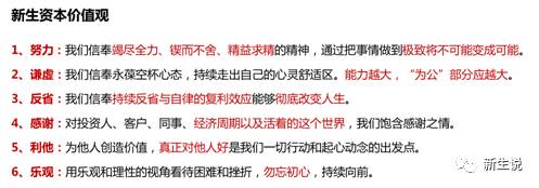 文化不是挂在墙上的,要落实到我们的行动中去。新生资本每周例会的第一件事是阅读阅读和分享使命愿景价值观,推动价值观融入到每天的工作中,自觉地注入到员工的起心动念中去,将文化导向贯彻到价值评价和分配机制中去。新生资本从今年开始,员工之间的差距会拉大,甚至到一定程度要向3G资本那样每年开除10%的人,前10%的人与后10%的人差距会非常大,我们要通过制度鼓励员工去开发内心的潜能。