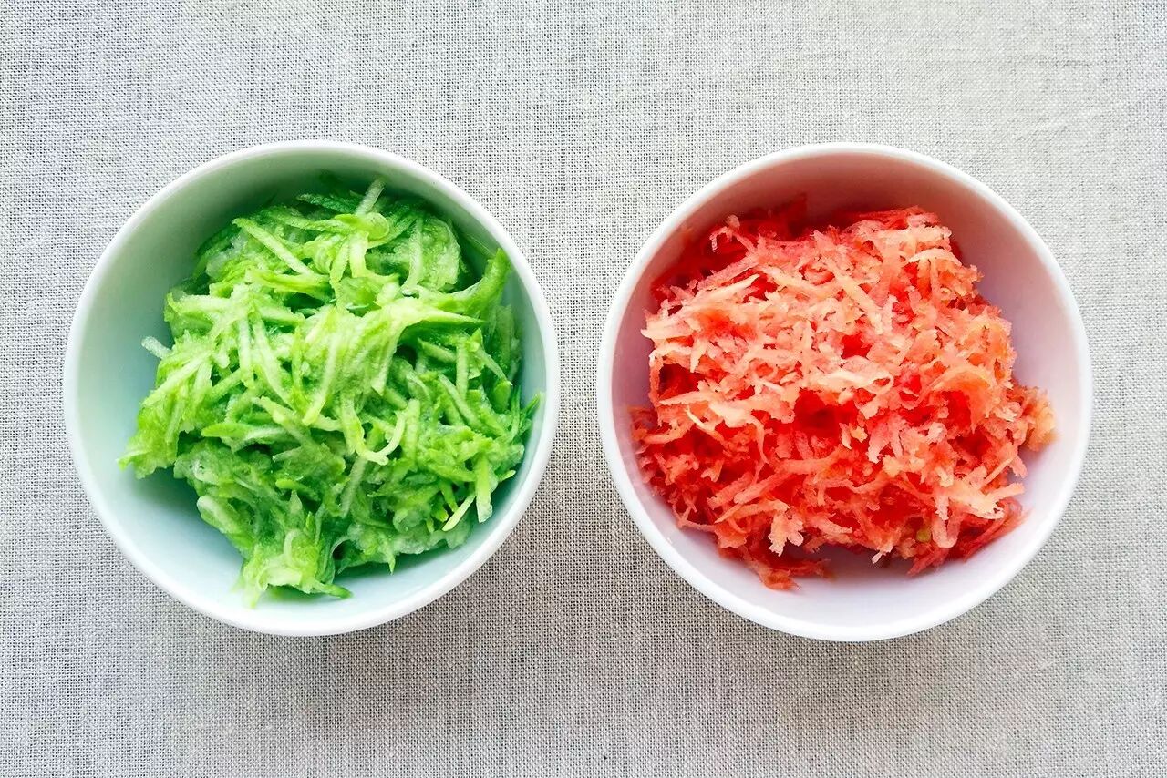 西葫芦、胡萝卜洗净擦丝装碗备用