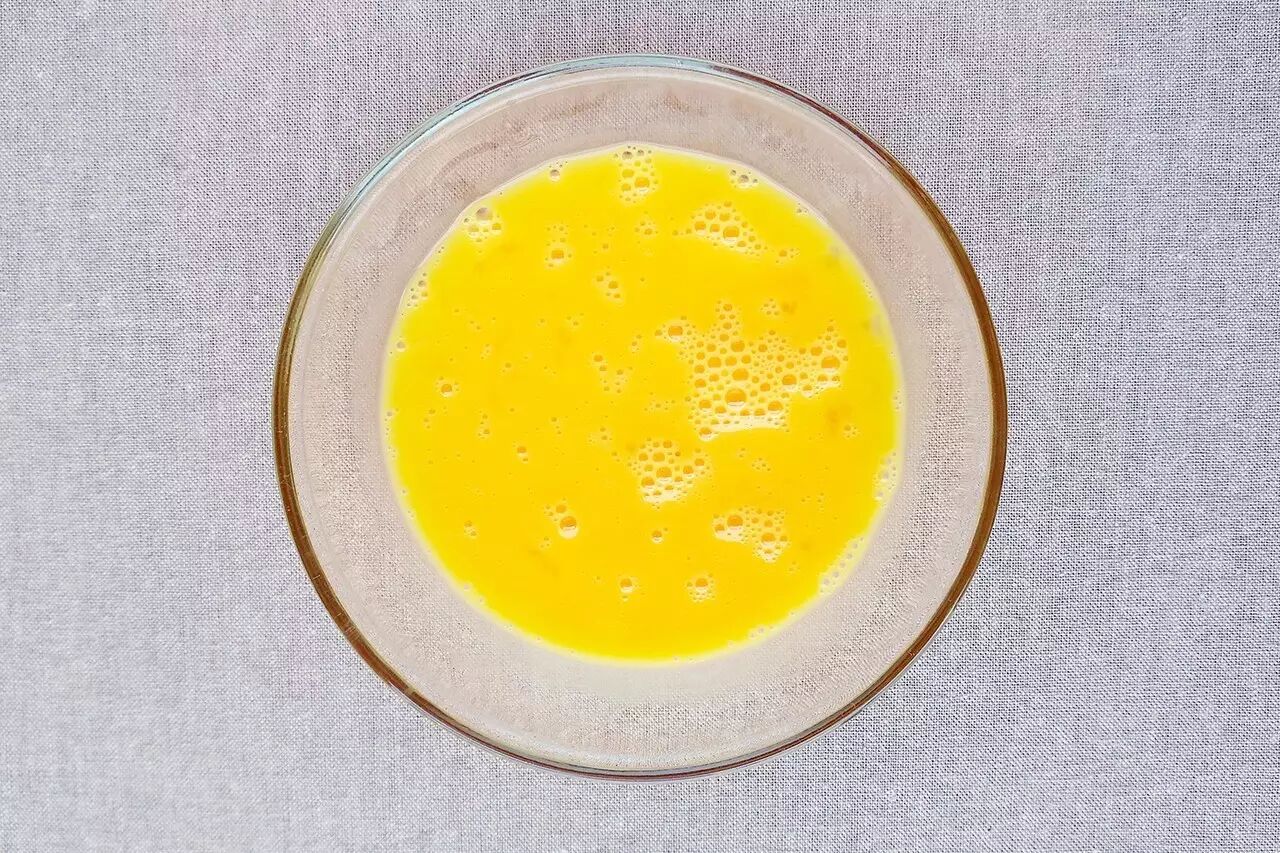 鸡蛋敲碎入碗,用筷子顺时针打成均匀蛋液,直至起泡。