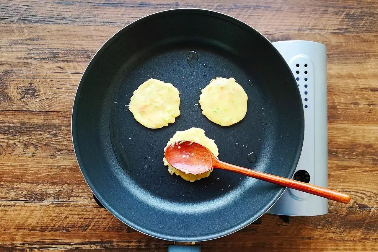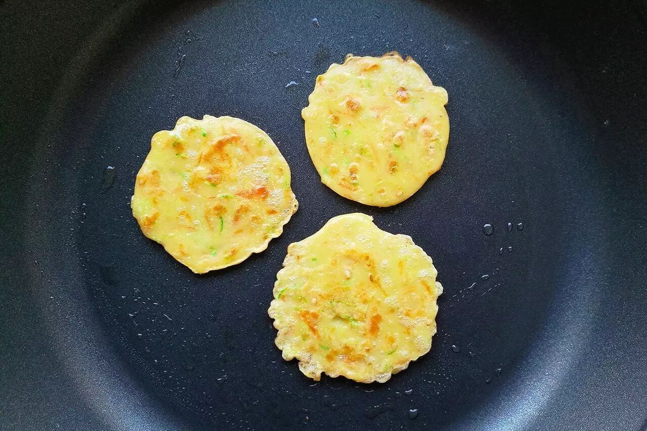 待面糊表面开始凝固后,用铲子轻轻将面饼与锅底分离,再将其翻面,待面饼双面都煎成金黄色时即可出锅。