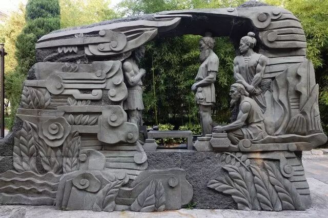 湖北武汉,汉阳江滩公园,大禹神话园“大禹治水”系列群雕,大禹治水雕塑《九尾狐说亲》。