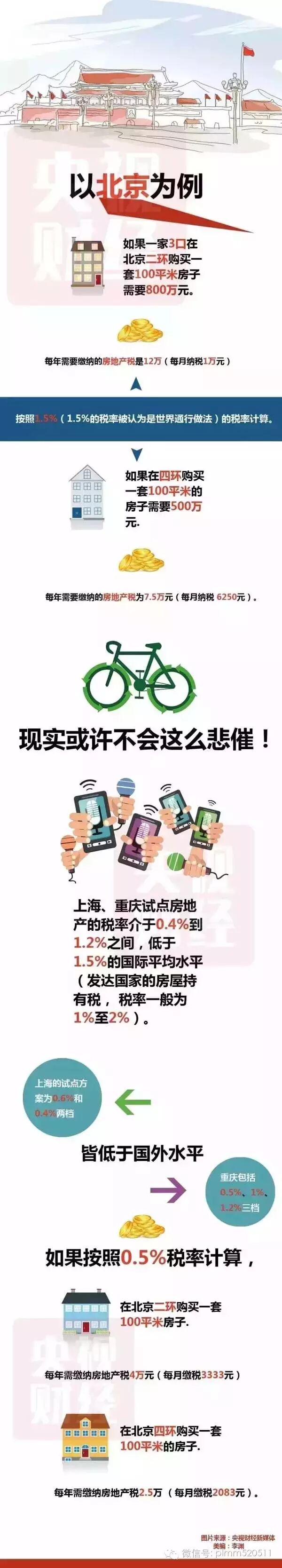 据记者了解,上海、重庆试点房地产的税率介于0.4%到1.2%之间,低于1.5%的国际平均水平(发达国家的房屋持有税, 税率一般为1%至2%)。上海的试点方案为0.6%和0.4%两档,重庆包括0.5%、1%、1.2%三档,皆低于国外水平。如果按照0.5%税率计算, 在北京二环购买一套100平米房子,每年需缴纳房地产税4万元(每月缴税3333元);在北京四环购买一套100平米的房子,每年需缴纳房地产税2.5万 (每月缴税2083元)。详情请看下图↓↓↓