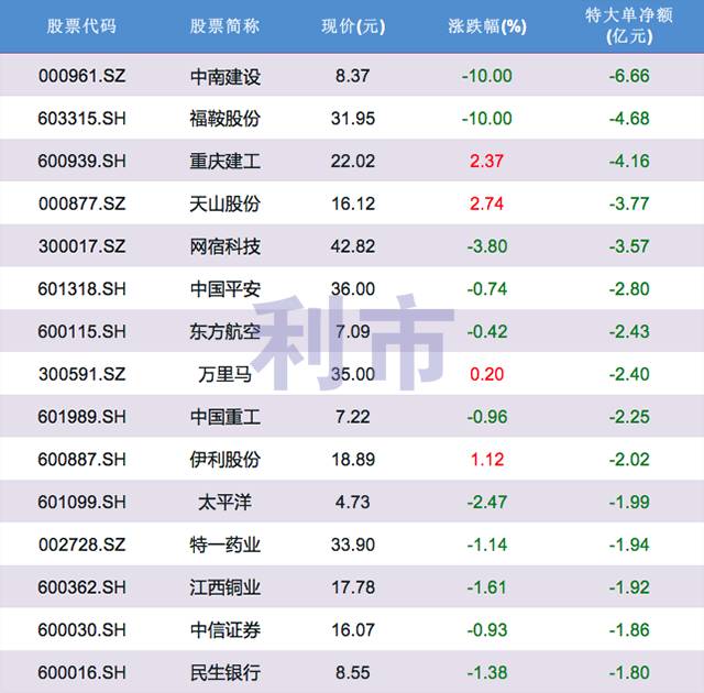 其中,放量跌停的中南建设,特大单净流出约6.66亿元,成为沪深两市周三特大单抛售王。周三特大单净流出2亿元以上个股,共有10家,分别为中南建设、福鞍股份、重庆建工、天山股份、网宿科技、中国平安、东方航空、万里马、中国重工、以及伊利股份。全天特大单净流出前30个股,主要集中在近期强势个股、以及银行券商个股。